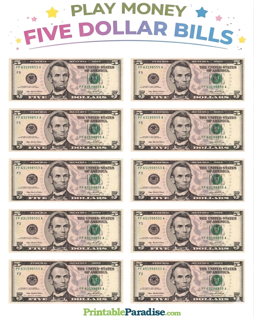 Printable Play Money - $5 Bills
